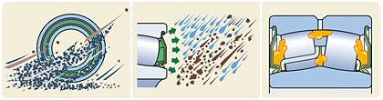 密封件嵌入外圈的凹槽。在小型轴承中,密封件压入凹槽;而在大型轴承中,密封件使用扣环定位。密封件有两个密封唇,在内圈滚道两侧同导入槽接触,提供有效的密封。